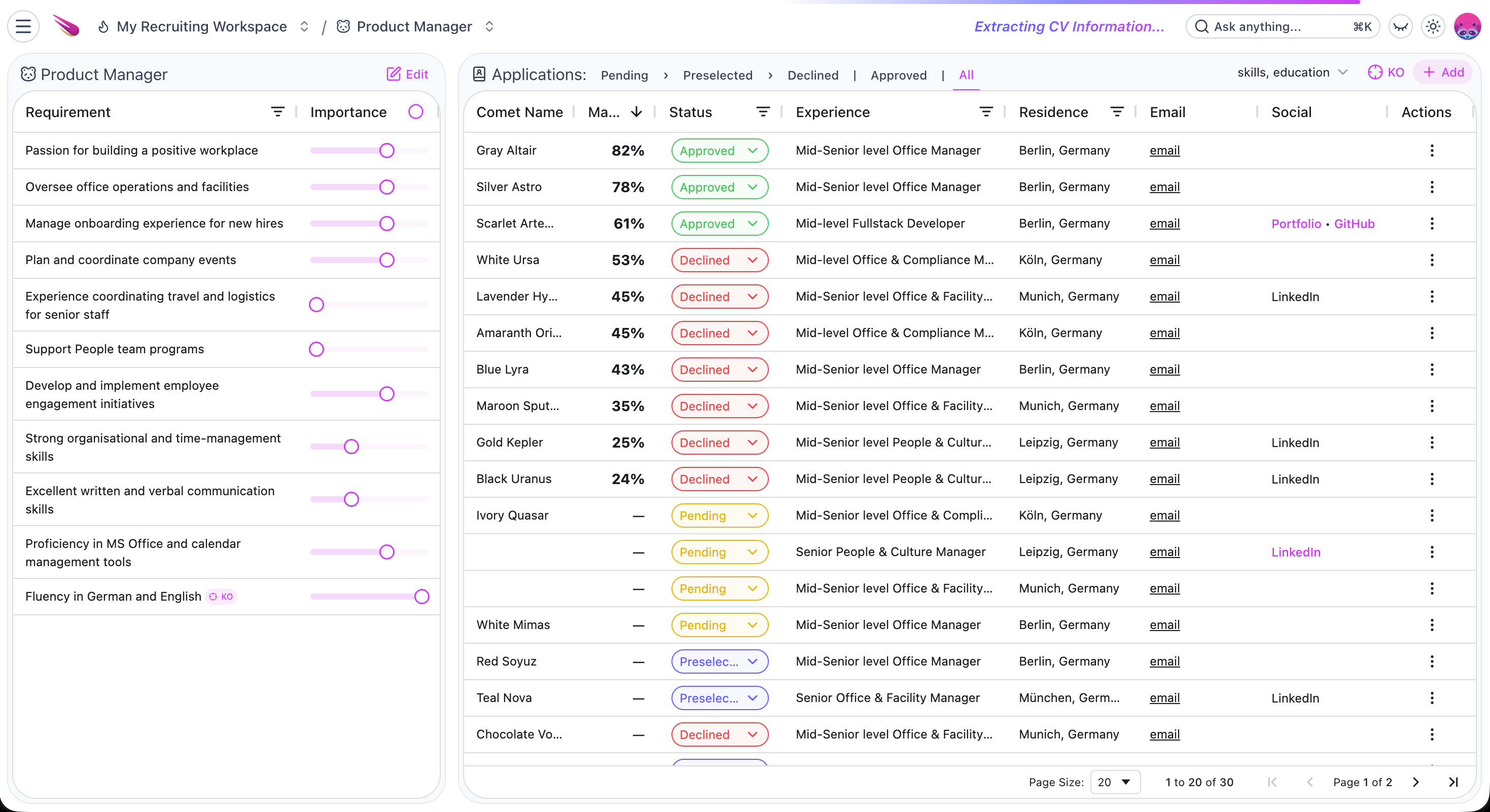 We designed CometHire according to ethical criteria. This means you remain in control at every step (human-in-the-loop principle). You define the selection criteria and evaluate the candidates – the AI co-pilot simply assists you. CometHire is GDPR and EU AI Act compliant.